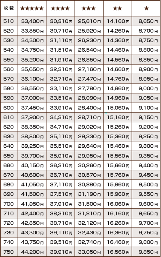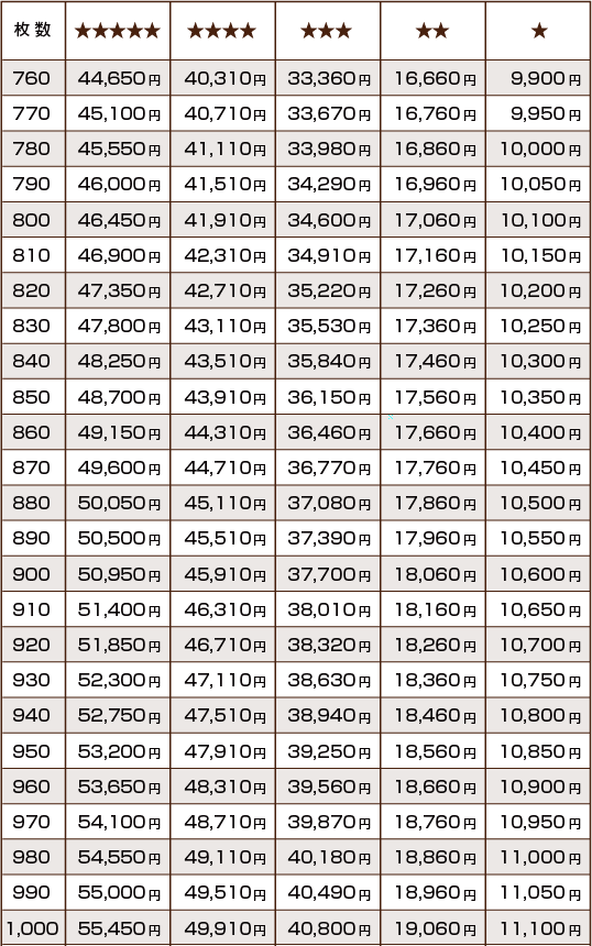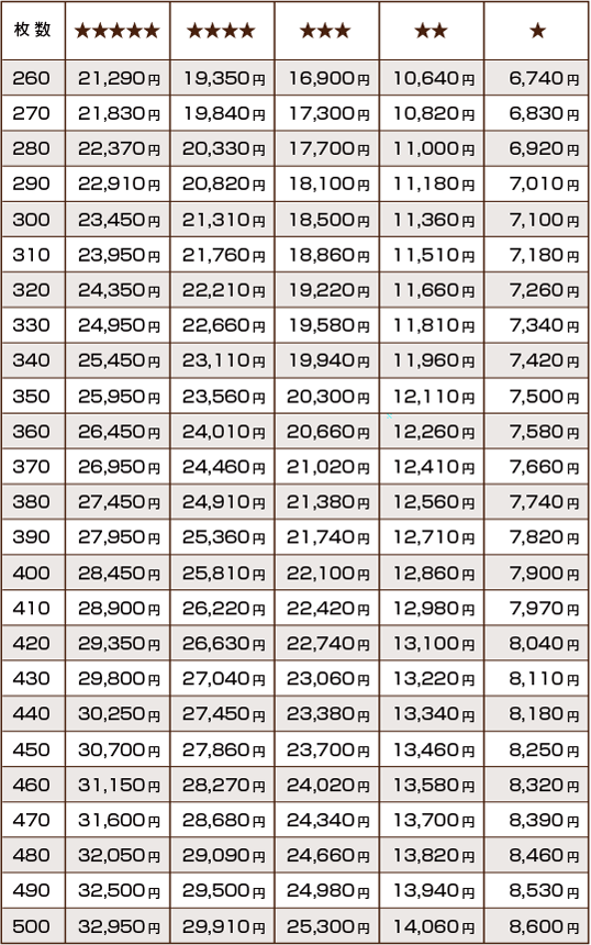 - 印刷料金(税別)は各デザインの★の数と印刷枚数により変わります。印刷料金一覧表